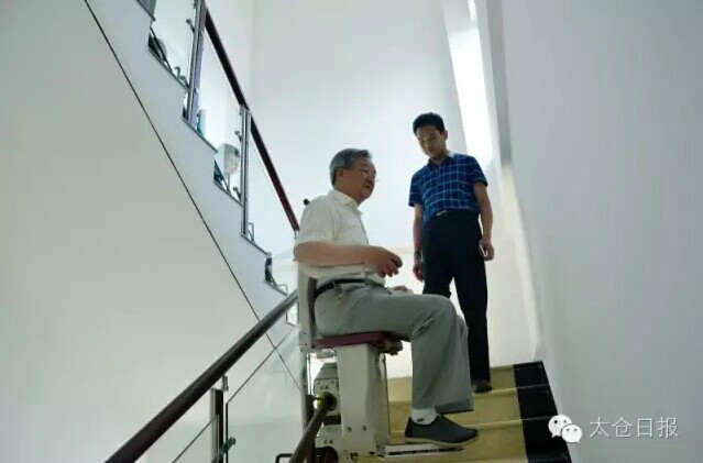 ▲ 張文康在體驗(yàn)樓梯升降椅